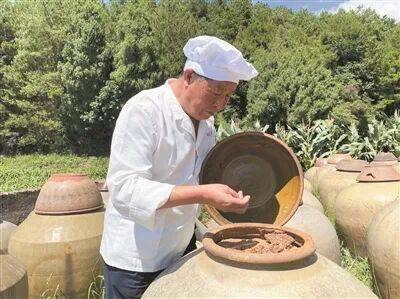 在禹谟镇新寨村温馨醋园,负责人温邦贤一边查看醋醅一边介绍:“醋在坛中要存放一年以上,我们这里晒着的醋醅年份各不相同,有的三五年,最长的甚至有20多年。”